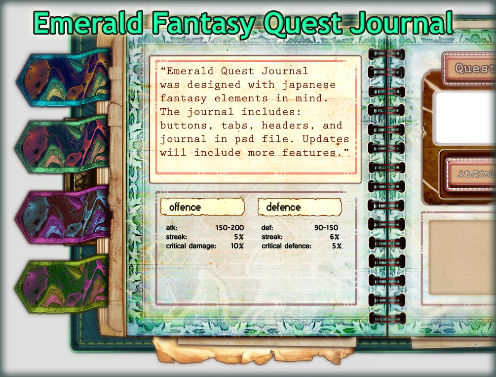 Emerald Quest Journal was designed with japanese fantasy elements in mind for game developers. If you're a fan of JRPG's this is for you!